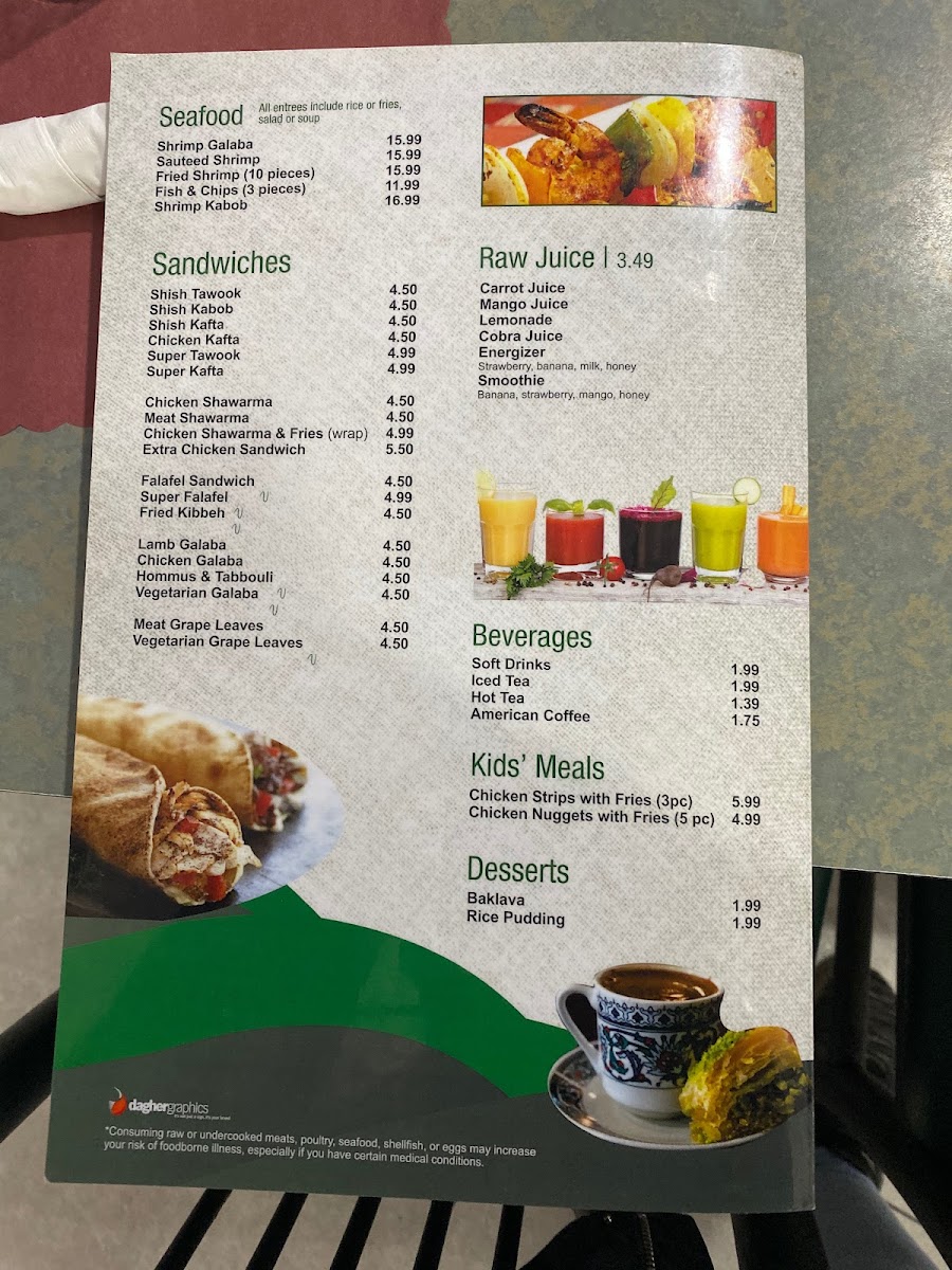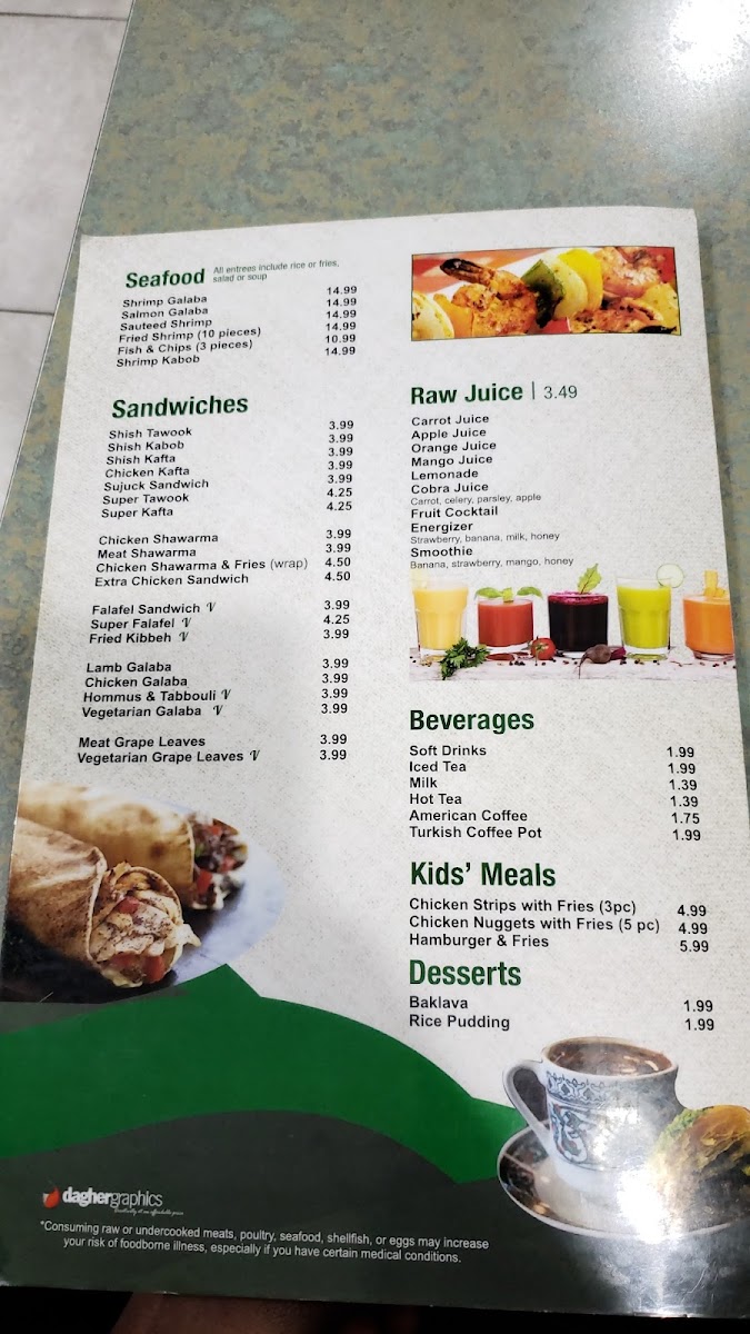 The ambiance inside Sam's Kabob House is casual and inviting, perfect for enjoying a family outing or a casual meal with friends. With an extensive selection of healthy options, including fresh juices and smoothie blends like the Smoothie Banana, Strawberry, Mango, and Honey (US$7.99), you can enjoy a refreshing start to your meal or a rejuvenating drink on its own.